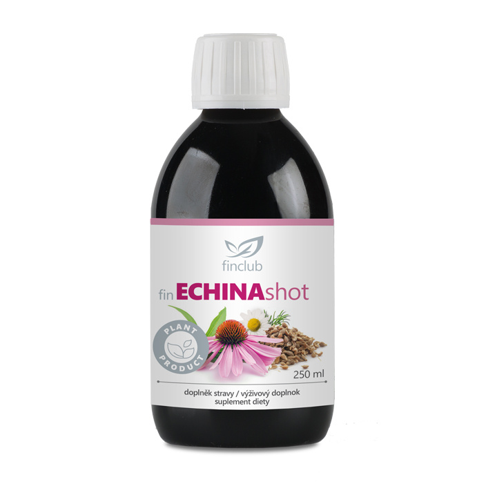 El suplemento dietético fin Echinashot contiene extractos de equinácea púrpura (Echinacea purpurea), manzanilla común (Matricaria chamomilla) y anís (Pimpinella anisum). Está endulzado con miel. Las hierbas que contiene favorecen las vías respiratorias, el correcto funcionamiento de los pulmones y la inmunidad natural del organismo. La equinácea púrpura tiene un efecto beneficioso sobre el sistema inmunitario, refuerza las defensas naturales del organismo, influye positivamente en el funcionamiento de las vías respiratorias superiores y favorece el funcionamiento del sistema urinario. La manzanilla común actúa como antioxidante, favorece la digestión y el correcto funcionamiento de las vías respiratorias, ya que ayuda a relajarlas. Favorece la salud mental y cognitiva, influye positivamente en el estado de ánimo, la relajación y el sueño, así como ayuda a mantener la piel en buen estado. El anís favorece el funcionamiento adecuado del sistema respiratorio, mejora la digestión y el apetito. La miel mejora el sabor del producto y constituye fuente de enzimas, minerales y vitaminas.