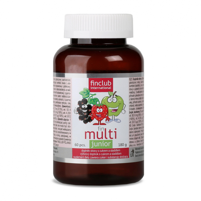 Este suplemento dietético consiste en unas sabrosas gominolas con forma de fresa y sabor natural a fresa. Contiene un complejo equilibrado de vitaminas (C, E, D3, B3, B6, biotina) que favorece el correcto funcionamiento del organismo, contribuye a las defensas naturales y tiene un efecto beneficioso sobre los huesos, los dientes y el sistema nervioso. Fin Multi Junior ayuda a complementar las vitaminas presentes en los alimentos y favorece el crecimiento, así como el desarrollo saludable de los niños. Contiene vitaminas procedentes de frutas, sin colorantes ni aromas artificiales.